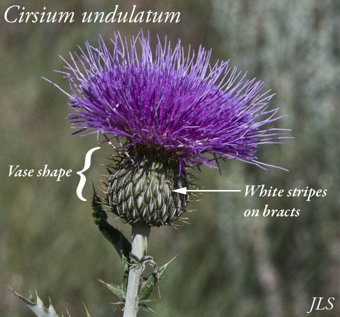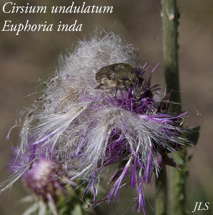 Also called Waveyleaf Thistle, and having a fatal resemblance to the invasive Carduus nutans, or Nodding Thistle, this native has a rough go. It is also colonized by the insect imported to control C. Nutans. Note the fuzzy leaves which are a soft sage green, and the white stripes on the bracts. Flowers which appear to have been torn apart probably contain a "Bumble Flower Beetle" (Euphoria inda), a scarab beetle who loves nectar. For more information, see this link: Wikipedia and Flora of North America