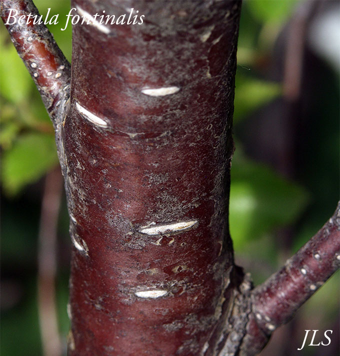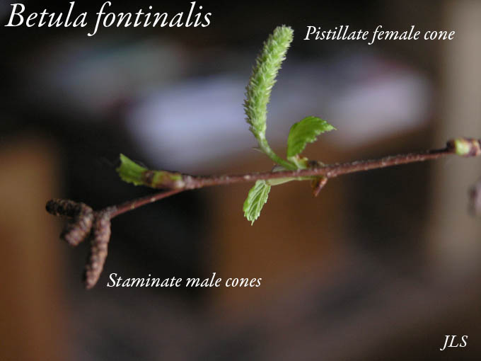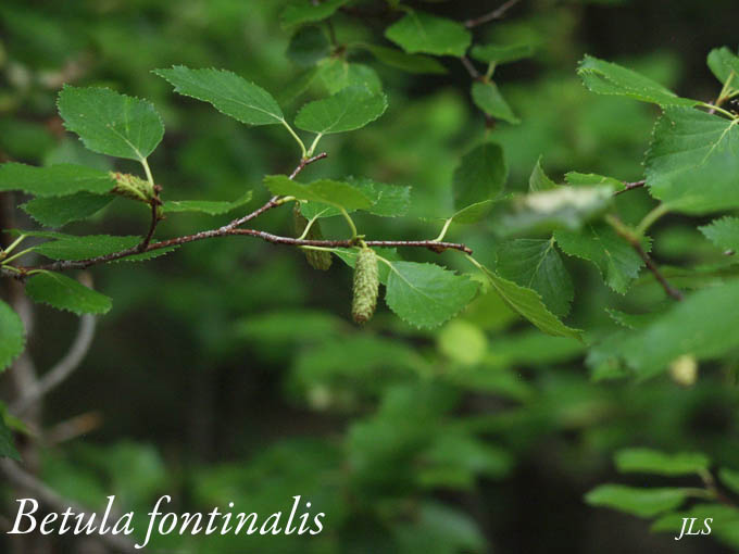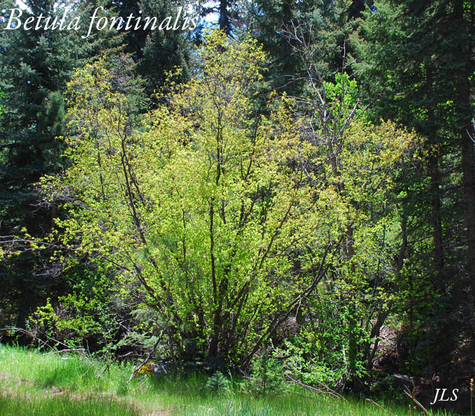 River birch grows in the wetter areas up here. It is technically a shrub, but I have linked it to both shrubs and trees. Betula fontinalis is its synonym. Wikipedia and Southwest Colorado Wildflowrrs have more information.