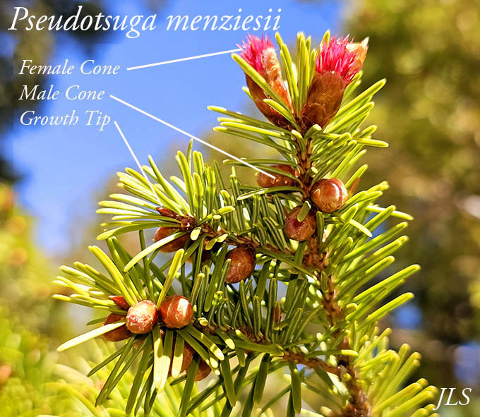 In spring, Dougfir sprouts "candles" on the ends of its branches. All conifers do this, but the ones on Dougfir are most obvious.