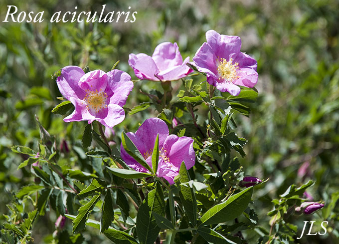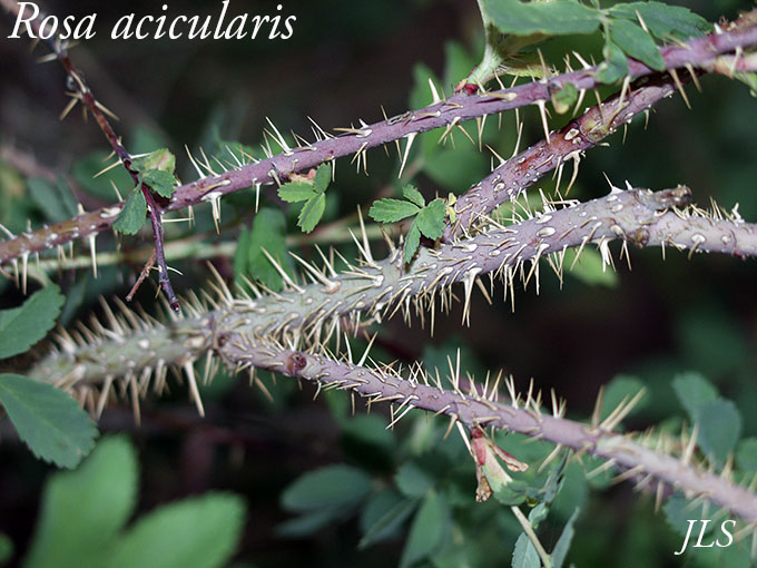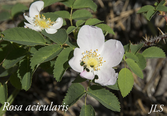 Our two roses hybridize, which makes everything more interesting. When they can be differentiated, Prickly Rose can be distinguished by its extremely prickly (duh) stems. Compare with Rosa woodsii, which has stout thorns.
