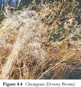 Cheatgrass is found in many open areas in the Magnolia area, and can often be found along roadsides (Figure 4.4). The seeds easily attach themselves to both people and animals, encouraging their spread. Cheatgrass sticks to footwear and socks, and can cause serious infections in pets when it works its way into their skin.