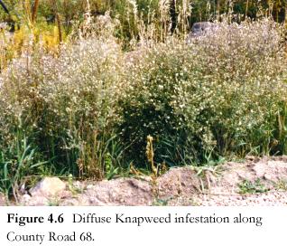 Diffuse knapweed is a many-branched annual or short-lived perennial, 1 to 3 feet tall. Reproducing only by seed, it has been found in the Magnolia area, specifically along the Front Range Trails and along County Road 68J (Figure 4.6).