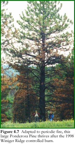 The results of fire suppression over the past century are dense, overstocked stands in ponderosa pine woodlands and Douglas-fir forests. If a natural fire regime were in place, ground fires would have eliminated most small trees, and most of the mature trees would be relatively unharmed, resulting in a more open and mature forest interspersed with large meadows. The lack of frequent surface fires permits an accumulation of fuel and an abundance of small trees that serve as fire ladders. The natural forest structure and composition cannot occur by natural means at this time, because the dense forests would succumb to a more destructive stand replacement crown fire where most of the trees, regardless of age and structure class, would be eliminated. This type of wildfire is much more destructive to trees, soils, and wildlife, and is potentially a far greater threat to human life and property.