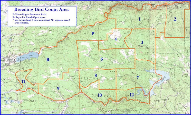 We used Colorado Breeding Bird Atlas protocol to search for breeding birds within the Magnolia area. We divided the area into 12, 3-7 km2 blocks (see map 5.1). Groups of 1-4 volunteers visited each block a minimum of 3 times for a minimum total of 12 hours between 1 June and 15 August 1997. Volunteers visited each major habitat type within each block at least once.