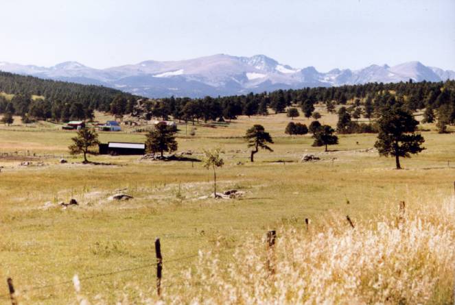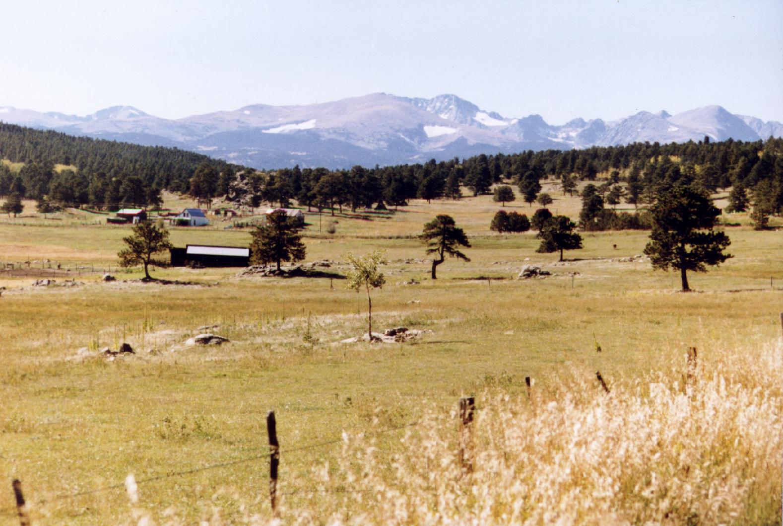 | Figure 8.3 Stilson's Meadow from Twin Sisters Ranch road. Note the historic ranch buildings. The high peaks of the Continental Divide are in the far background. |
