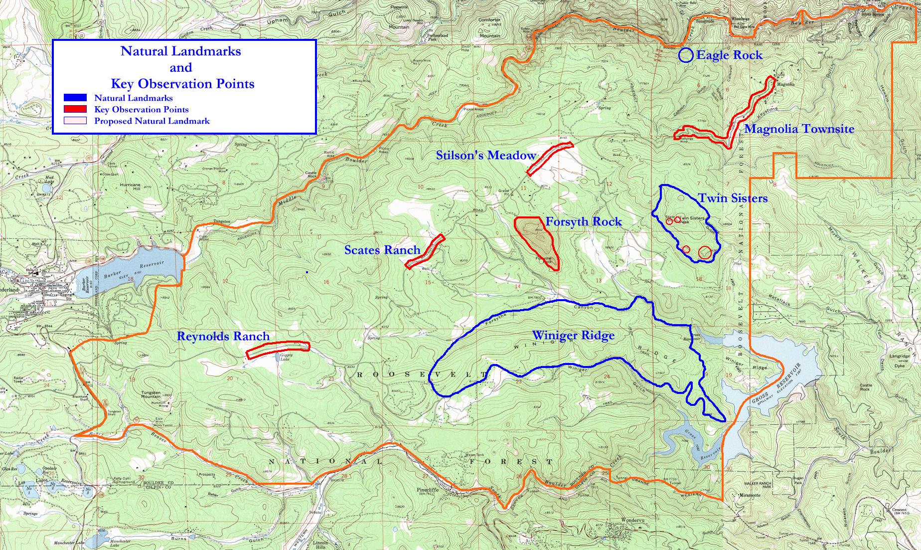 Important meadows include Stilson Meadow along both sides of Magnolia Road, the southern portions of Twin Sisters Ranch, Scates Ranch north of Magnolia Road, and Reynolds Ranch along the western portion of Magnolia Road. All of these meadows include limited wetland or riparian ecosystems, and several of them have aspen stands that transition from the open grasslands to dense coniferous forest. Views from these meadow sites include forested slopes and rock outcrops within and adjacent to the Planning Area, as well as some of the high peaks of the continental divide. And they also include remnant structures from historical ranching operations.