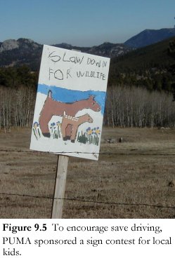 Poignant signs discouraging speeding were made by children in the neighborhood and were erected at several points along Magnolia. Many ideas have been suggested for controlling speeding, but consensus has not been reached. PUMA should continue a dialog with Boulder County officials concerning practical and effective solutions to these concerns.