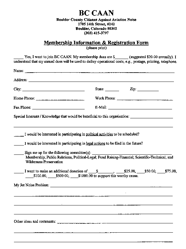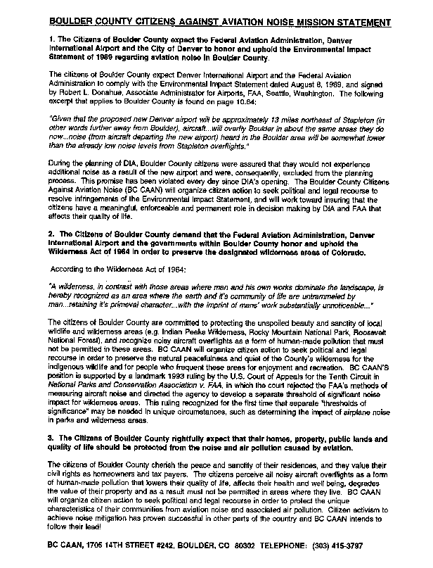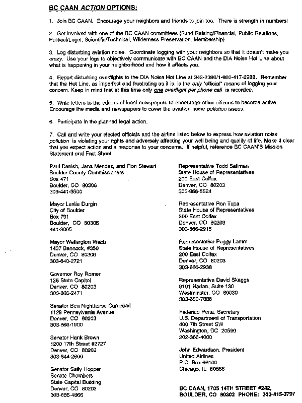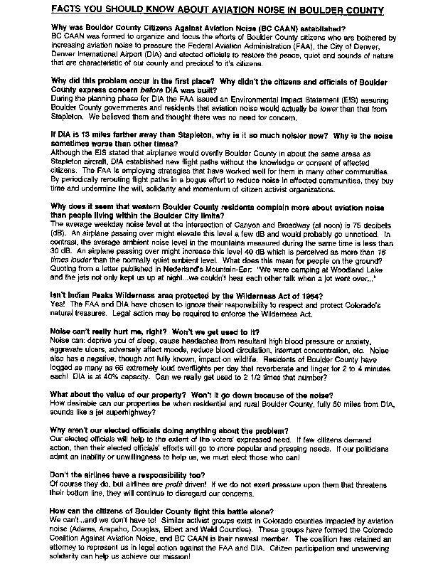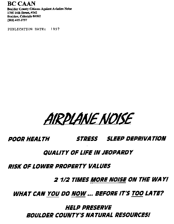 BC CAAN: As an organization, Boulder County Citizens Against Aviation Noise has been inactive and ineffective for a couple of years now, due to a lack of leadership and citizen involvement. We, and a few other citizens, have kept the issues alive as best we can by making calls, doing research, writing letters, sharing information on the Internet, etc. In order to continue as an effective organization, BC CAAN needs to reform under new leadership. If you would like to get involved in reforming BC CAAN, please leave us a message on the BC CAAN Info Line (303 415 3797), or email to oval@bouldenews.infi.net at your earliest convenience.