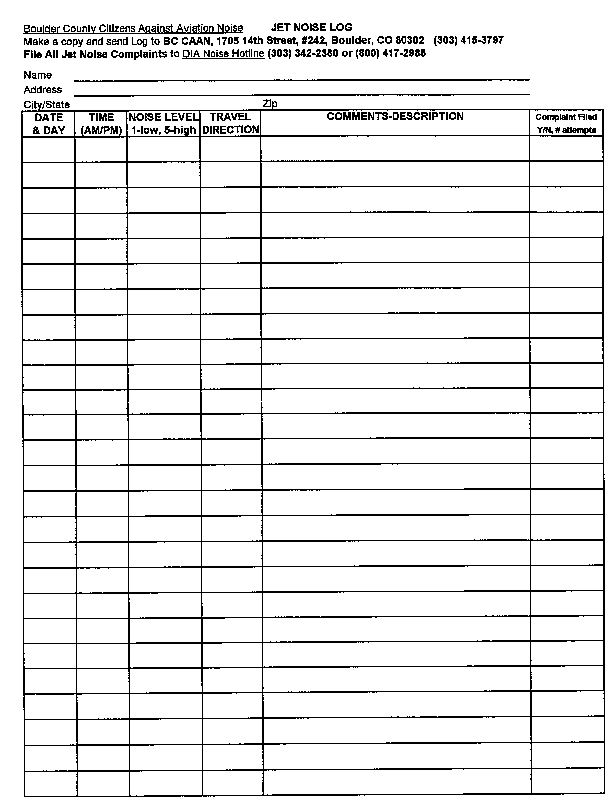 Three positive results of this meeting: the Noise Abatement Office will now accept faxed noise complaint logs from citizens (see next section); and McKee plans to send a letter to the airlines requesting a voluntary re routing of hush kitted stage 2 aircraft. Lastly, representatives from the DIA Noise Abatement Office are willing to meet with interested groups either in their office or at a meeting place in Boulder (see next section). The Commissioners and the Noise Abatement Office are responding to the growing number of citizen complaints, and we thank them!