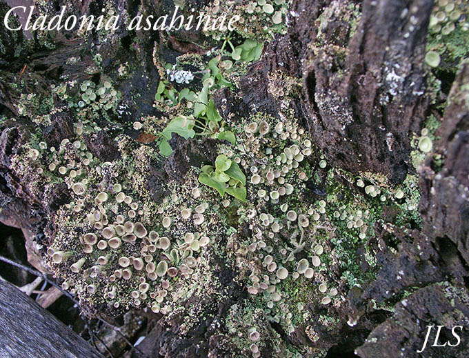 I took this photo with the microscope, and couldn't get any text to fit. It is Cladonia asahinae showing its squamules, which look like tiny eggs in a nest.