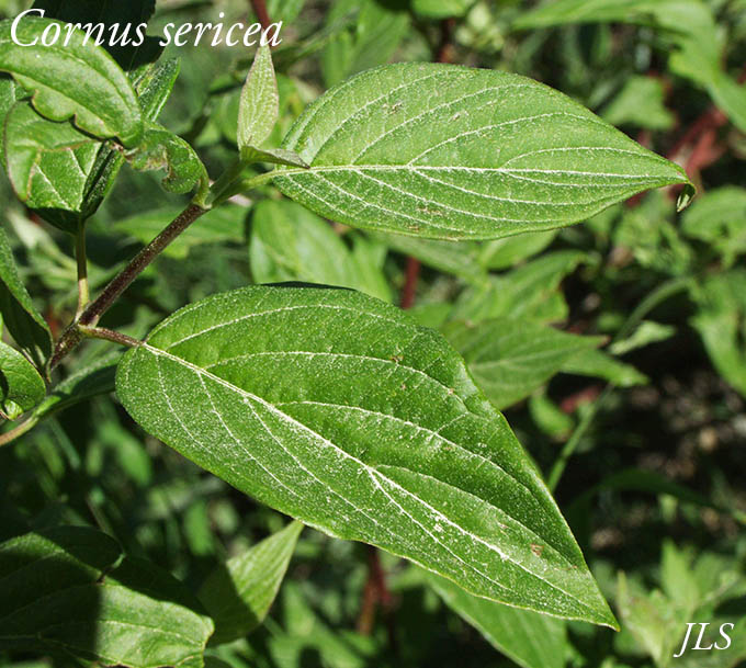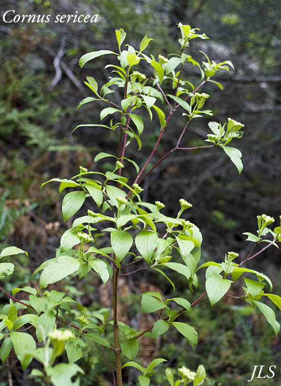 This shrub has red branches and loves wet areas. There are some truly large examples on the Waterfall Trail. Its synonym is Cornus alba; see FNA for comments, as well as Wikipedia and Southwest Colorado Wildflowers.