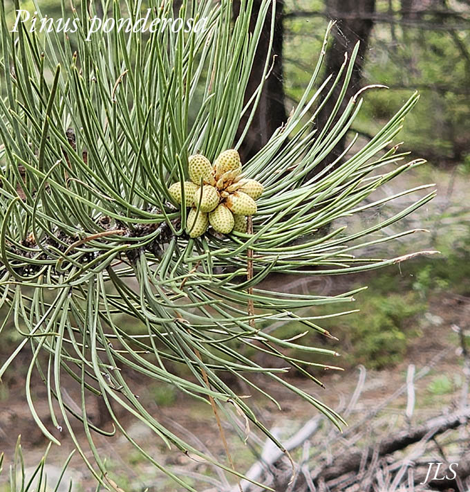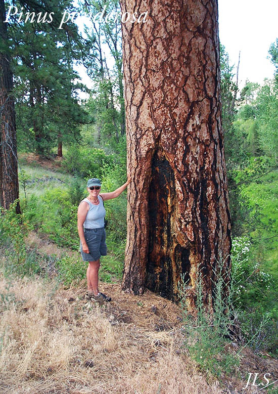 Pinus ponderosa predominates on south facing slopes, and is supposed to be a tree of the savanna. Our woods are too thick, which contributes to disease and fuels overload. Wikipedia, USDA, and Southwest Colorado Wildflowers have more information.
