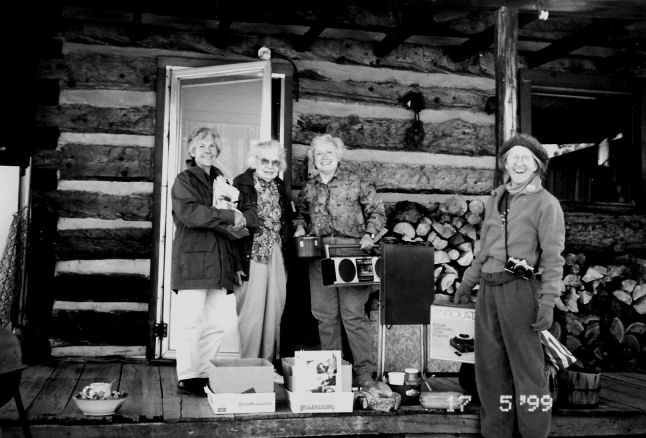 They arranged to go to Edith’s home on the evening of April 19, 1999, carrying a potluck supper and equipment to show the slides and to record Edith’s comments. Although shy about being recorded that first evening, Edith joyously welcomed Marianne, Bonnie, and Jan at her kitchen door (Figure 2: Marianne, Edith, Jan, and Bonnie). After supper, the group gathered around her in the living room. George Giggey stopped by daily to give Edith “her meds” and he stayed on to view the slides.