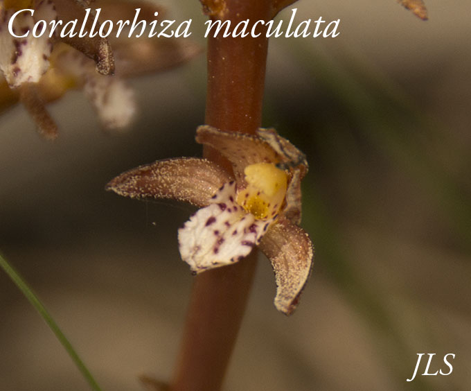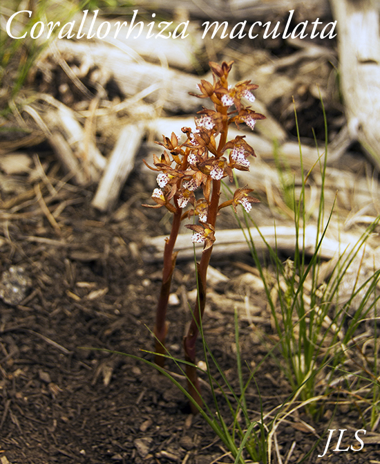 Found in forests, this little orchid has no chlorphyll at all. The Coralroots are "mycotrophs", and are parasitic on fungi which absorb nutrients from decaying plant matter. C. maculata differs from C. wisteriana in that it blooms later, and its flowers have three lobes on the lower lip. Wikipedia and Southwest Colorado Wildflowers have additional information.
