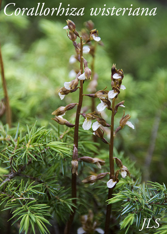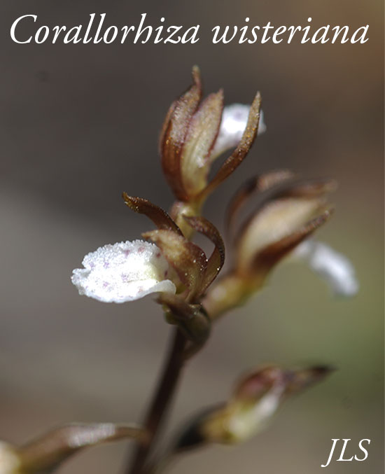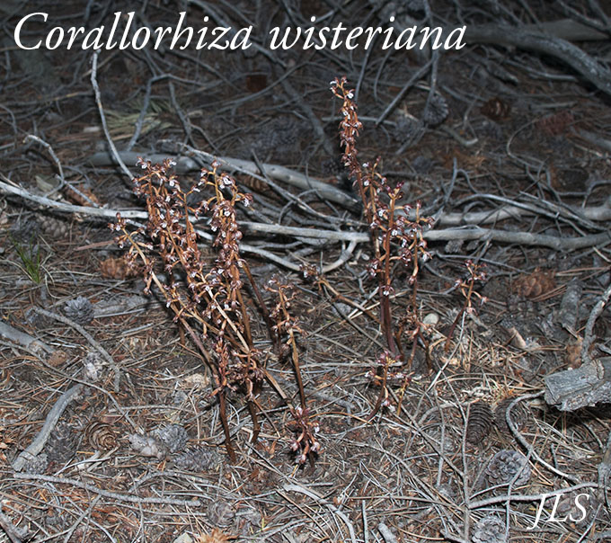 These bloom earlier than their cousin, Corallorhiza maculata, or Spotted Coralroot. The Coralroots are "mycotrophs", and are parasitic on fungi which absorb nutrients from decaying plant matter. C. wisteriana differs from C.maculata in that it blooms earler, and its flowers have no lobes on the lower lip. Wikipedia and Southwest Colorado Wildflowers have more information.